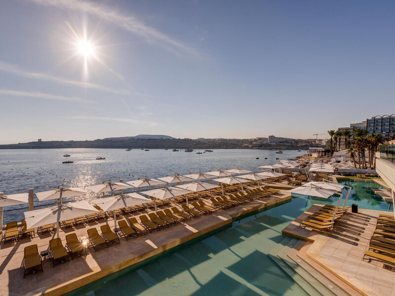 Adults-only infinity pool “Minoa Deck” v 11. patře; panoráma St Paul’s Bay, vířivky a vlastní pool-bar