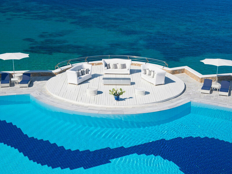 Luxusní hotel v kykladském stylu je členem Small Luxury Hotels of the World nabízí ubytování ve 107 pokojích. Součástí hotelu je i venkovní kamenný amfiteátr. Na pláži nejsou povolené vodní sporty, takže hosté mohou na pláži ničím nerušeně relaxovat.