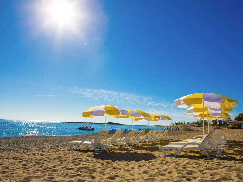 Pláž:Písečná pláž (při vstupu do moře drobné oblázky), lehátka, slunečníky a podložky zdarma, osušky oproti kauci, bar, restaurace, sprchy a převlékárna na pláži.