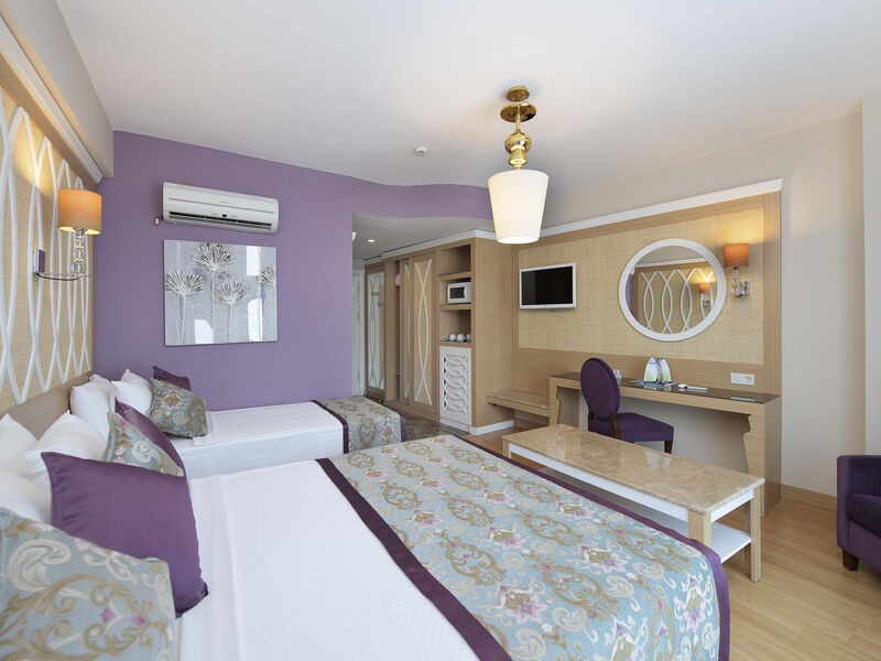 Vybavení pokojů:Dvoulůžkový pokoj: koupelna/WC (vysoušeč vlasů), klimatizace, wifi (zdarma), TV, telefon, trezor (zdarma), minibar (denně doplňován vodou), set na přípravu kávy a čaje, balkon nebo terasa, velikost pokoje 25-27 m2, může být umístěn kdekoliv v rámci areálu.