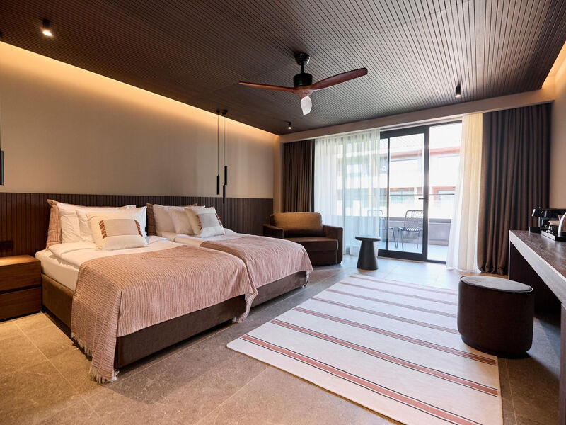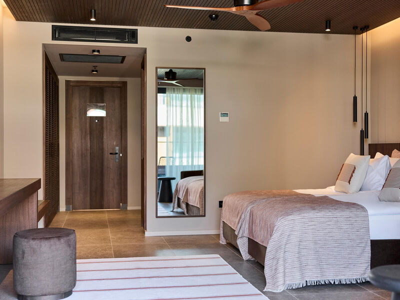 Vybavení pokojů:Dvoulůžkový pokoj: koupelna/WC (vysoušeč vlasů, klimatizace, TV/Sat., telefon, WiFi, mini lednička, pohovka, balkon nebo terasa, 31 m2.
